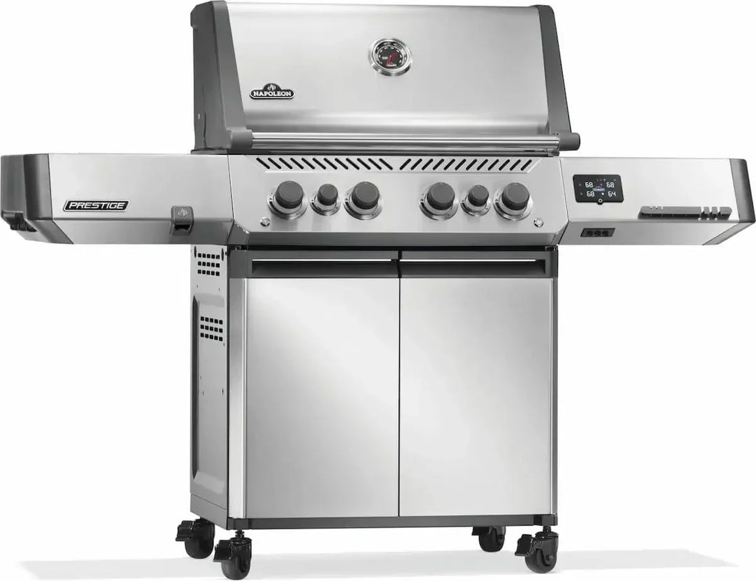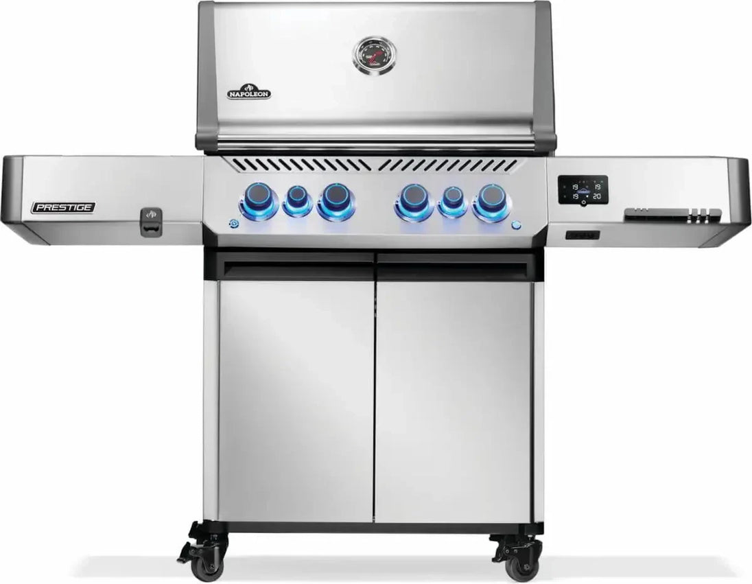 Upgrade your gas grill with the Napoleon Prestige 500 Connected Gas Grill. With Wi-Fi and Bluetooth connectivity, you can easily monitor temperatures, set timers and receive high-temperature warnings all from your phone. The LCD display and temperature probes ensure precise BBQ, while the infrared sear station and larger rotisserie burner enhance performance. LED Control Knobs with SafetyGlow™ technology add a touch of safety and style.