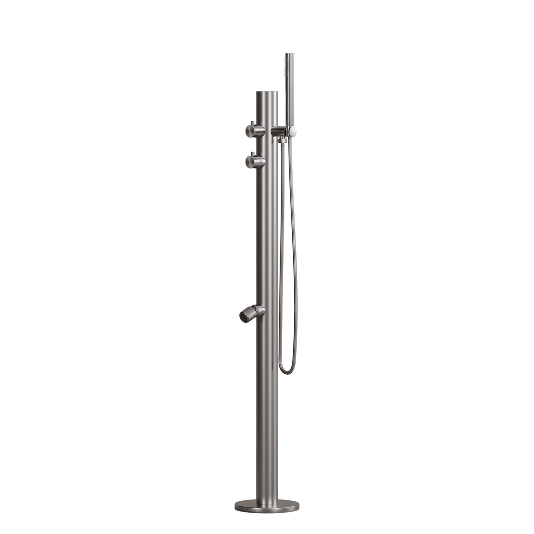 Freestanding outdoor rinse station with pressure balance valve, two-way diverter, foot wash, and hand shower made of 316 marine grade brushed stainless steel.