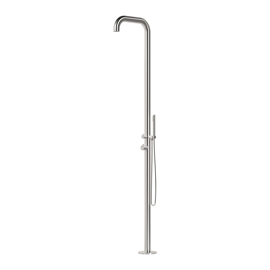Freestanding outdoor shower with pressure balance valve, two-way diverter, and hand shower made of 316 marine grade brushed stainless steel.